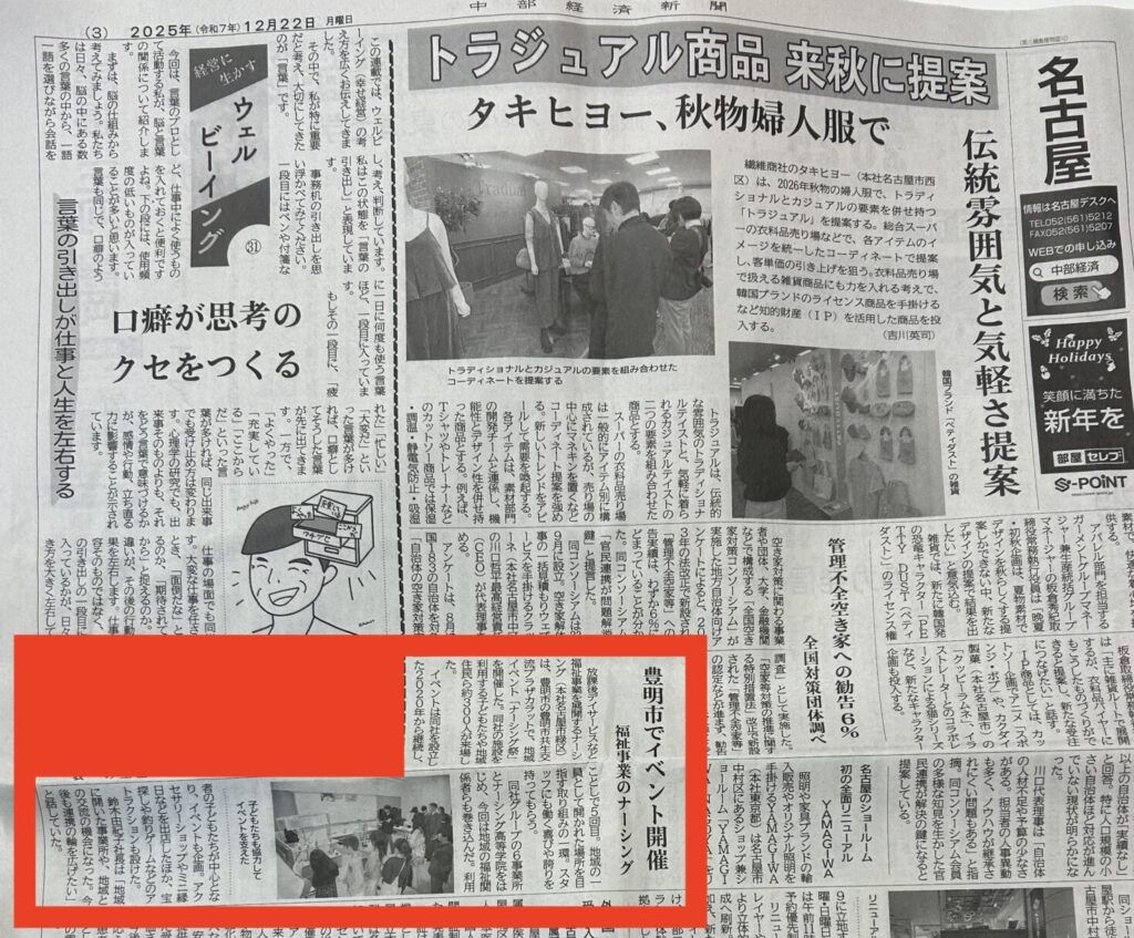 2024/12/22 中部経済新聞3面に掲載いただけました。地域の方へ、弊社の活動を発信いただける機会をいただき、誠にありがとうございます!